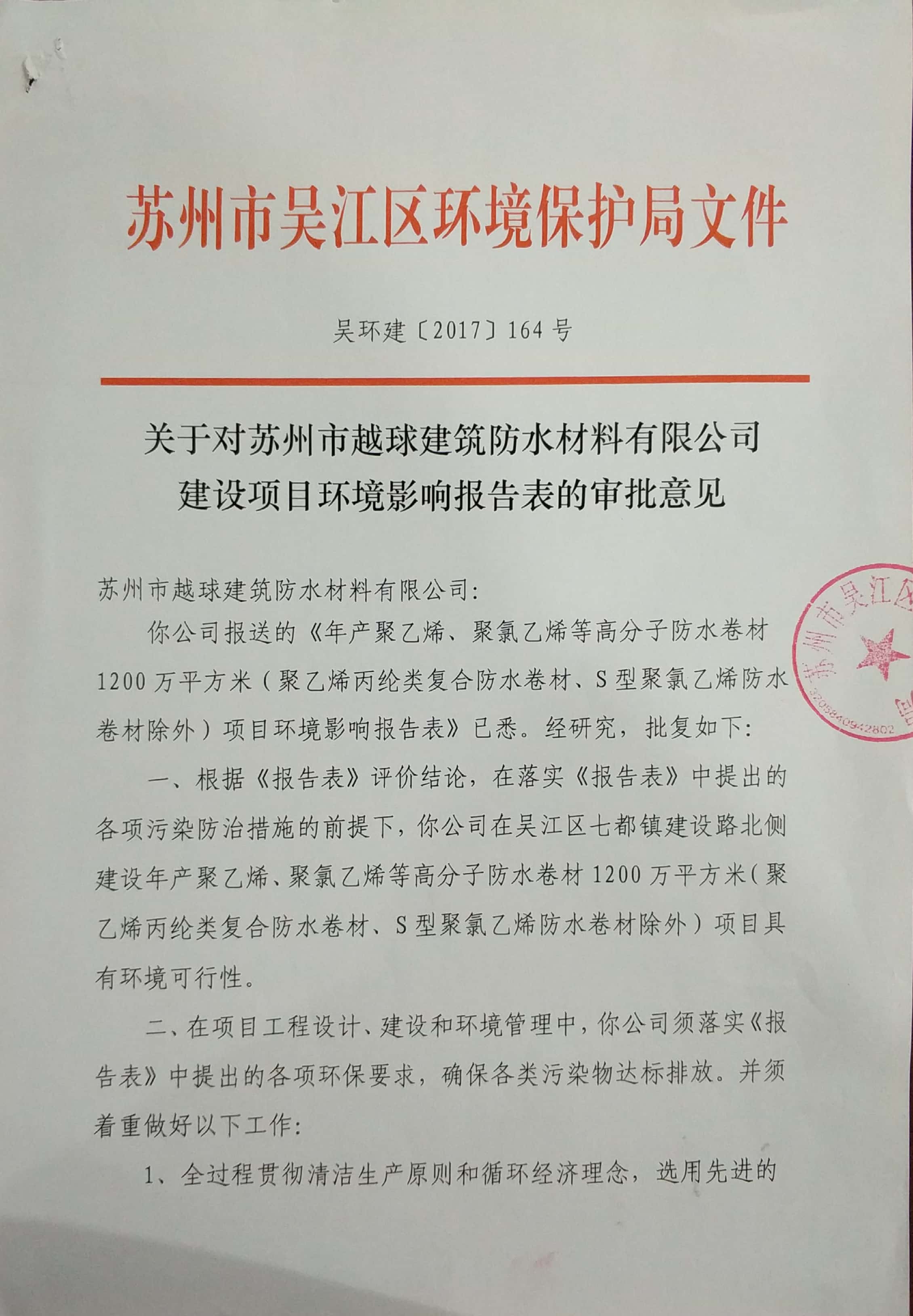 關(guān)于對(duì)蘇州市越球建筑防水材料有限公司建設(shè)項(xiàng)目環(huán)境影響報(bào)告表的審批意見(jiàn)